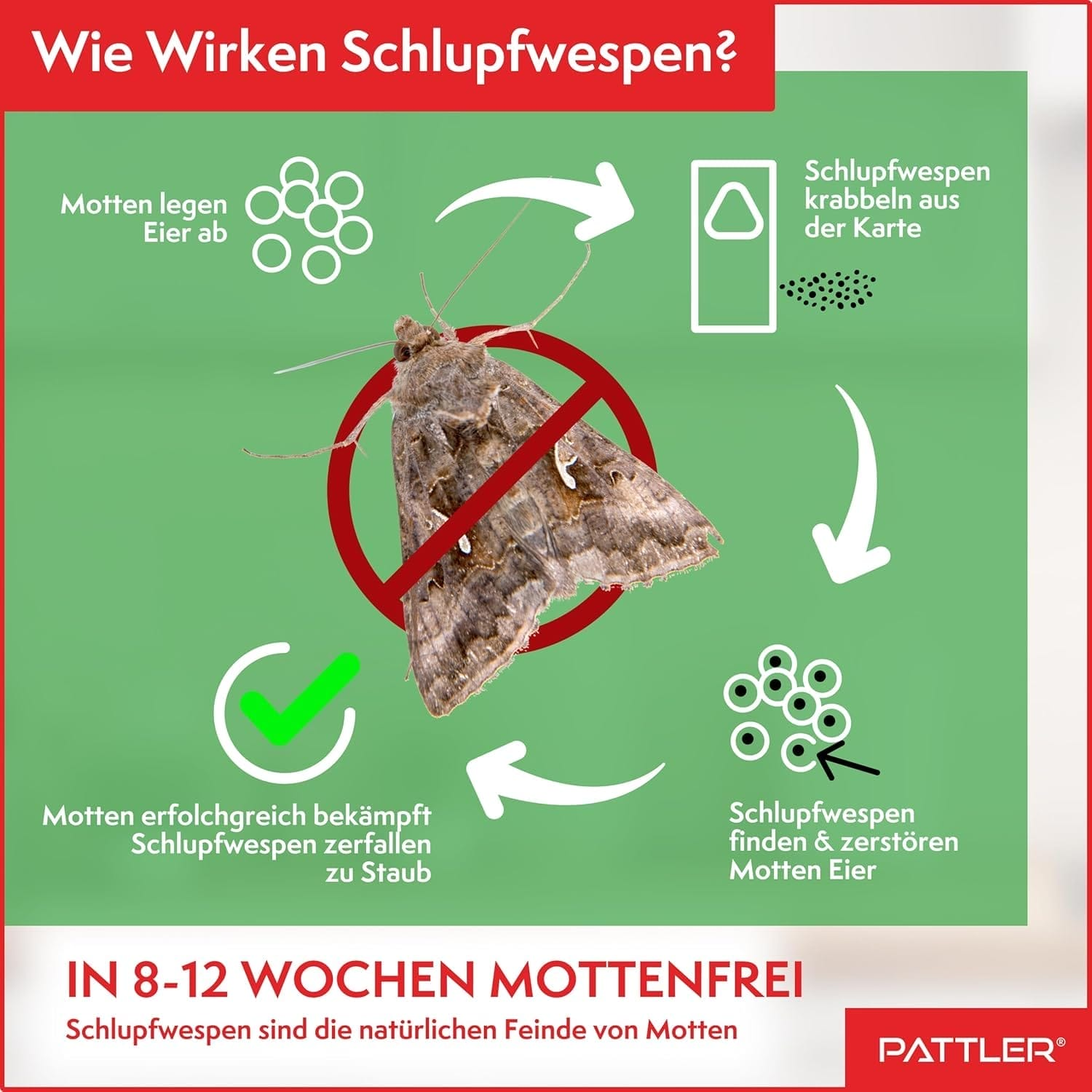 Die PATTLER® Schlupfwespen sind kleine Insekten. Sie suchen gezielt die Kleidermottenlarven. Die Wespen heften sich an die Larven und töten sie. So wird der Mottenkreislauf unterbrochen. Die Ausbreitung der Motten stoppt. Dabei belastet diese Methode die Umwelt nicht.Einfache Anwendung in 3 Karten:
